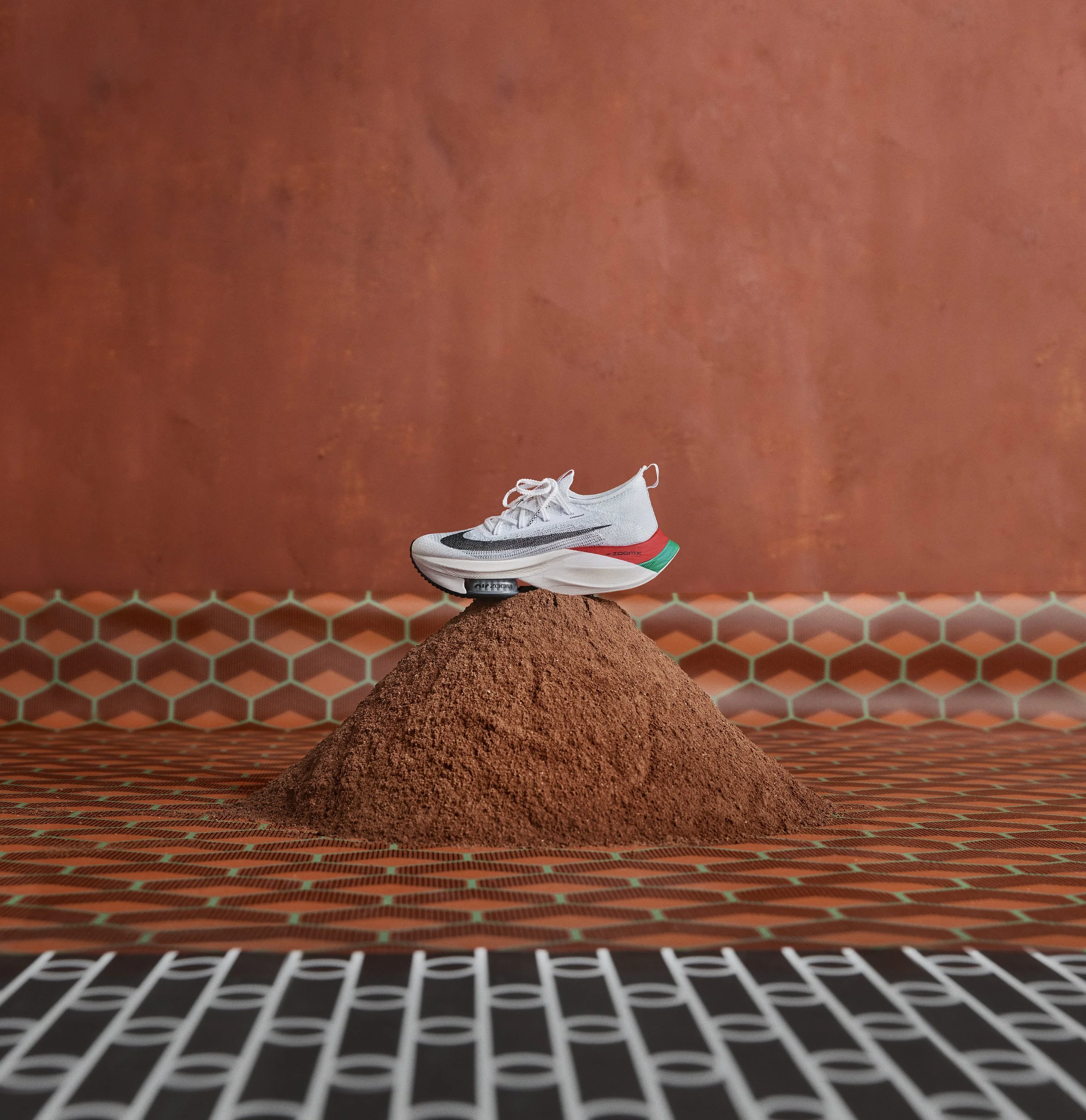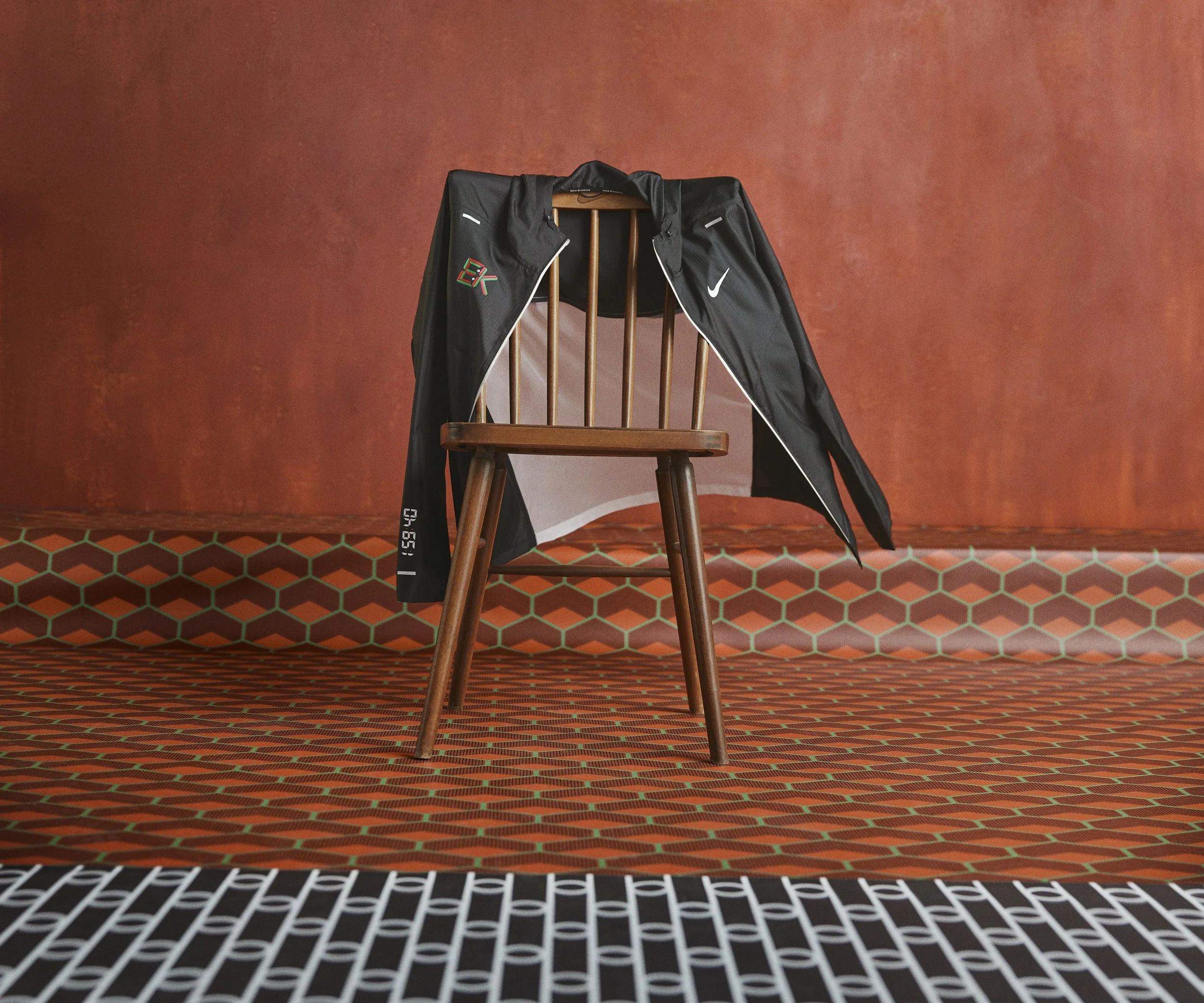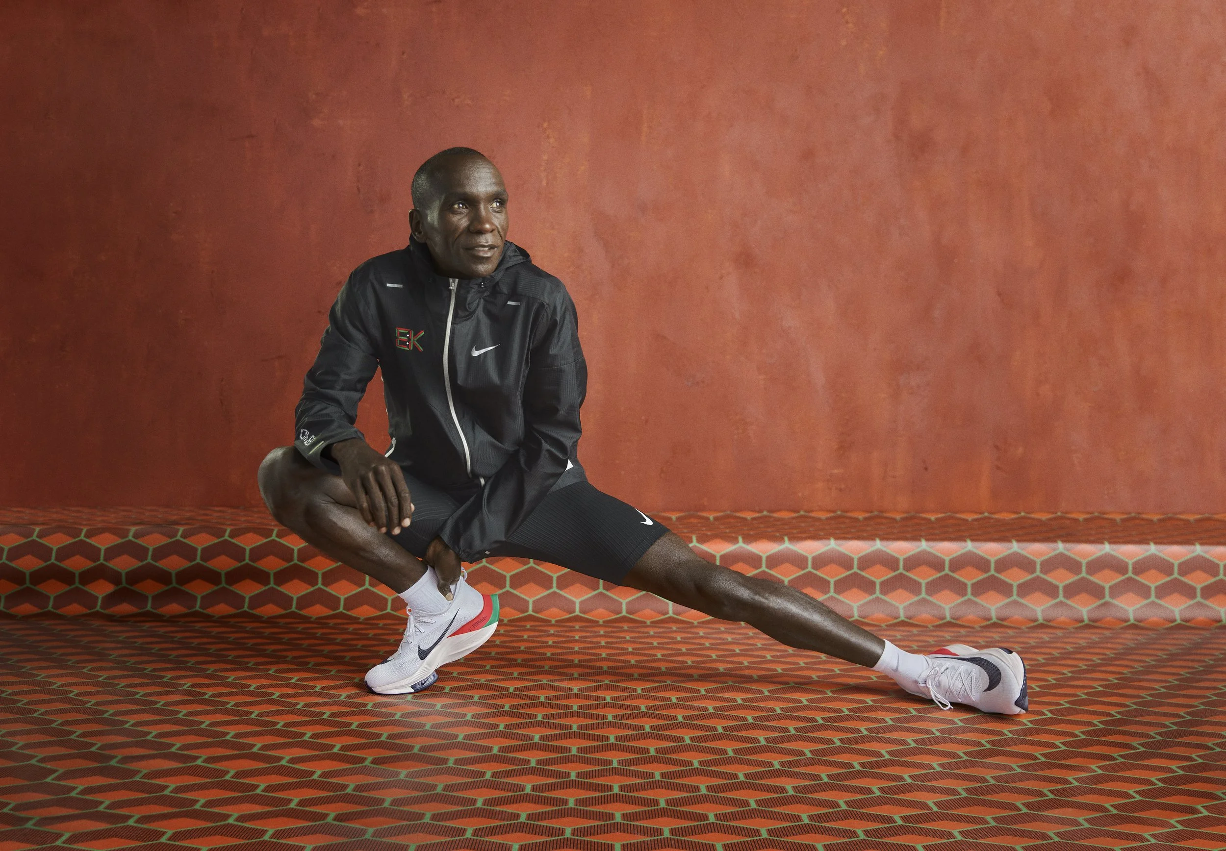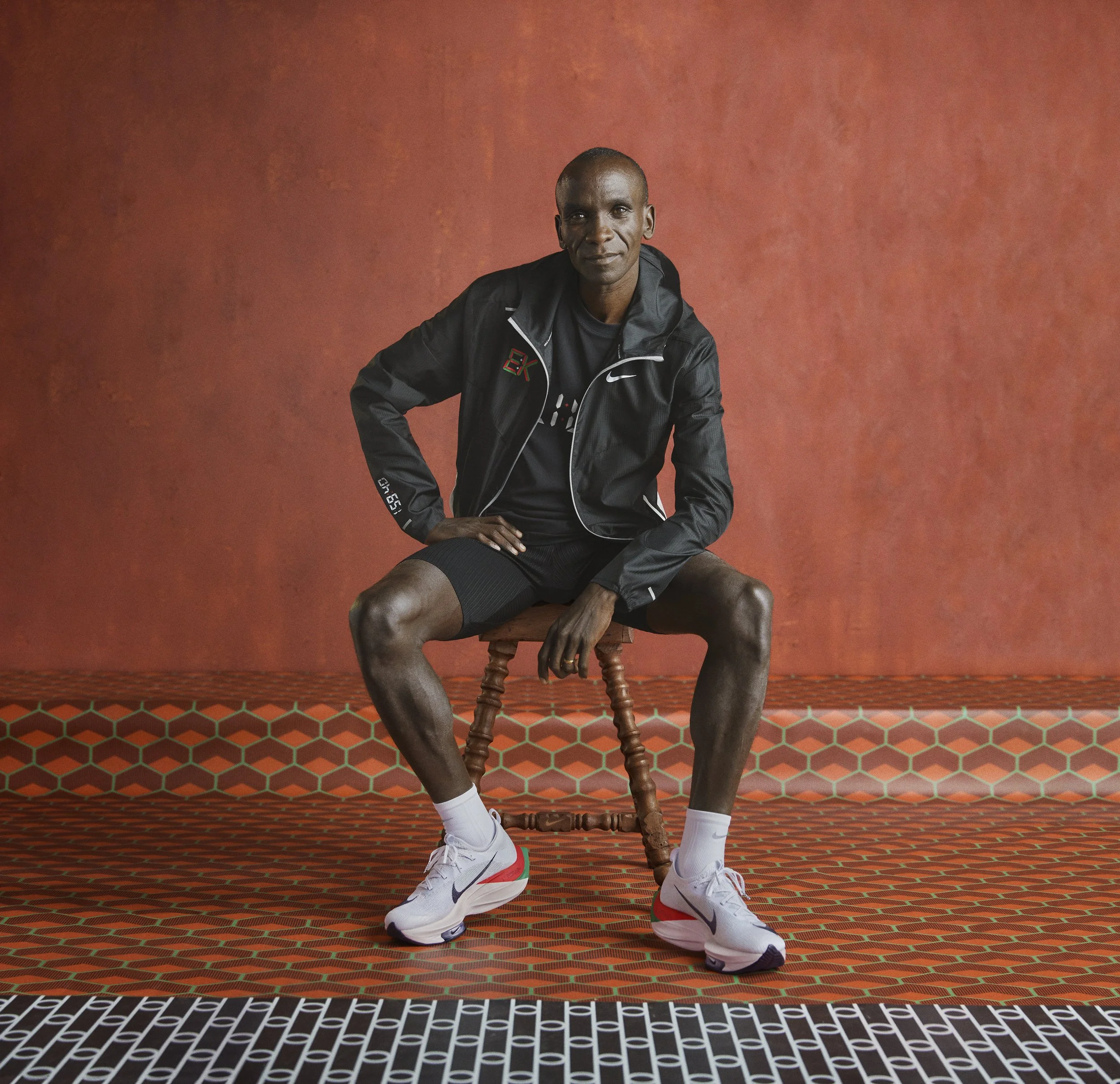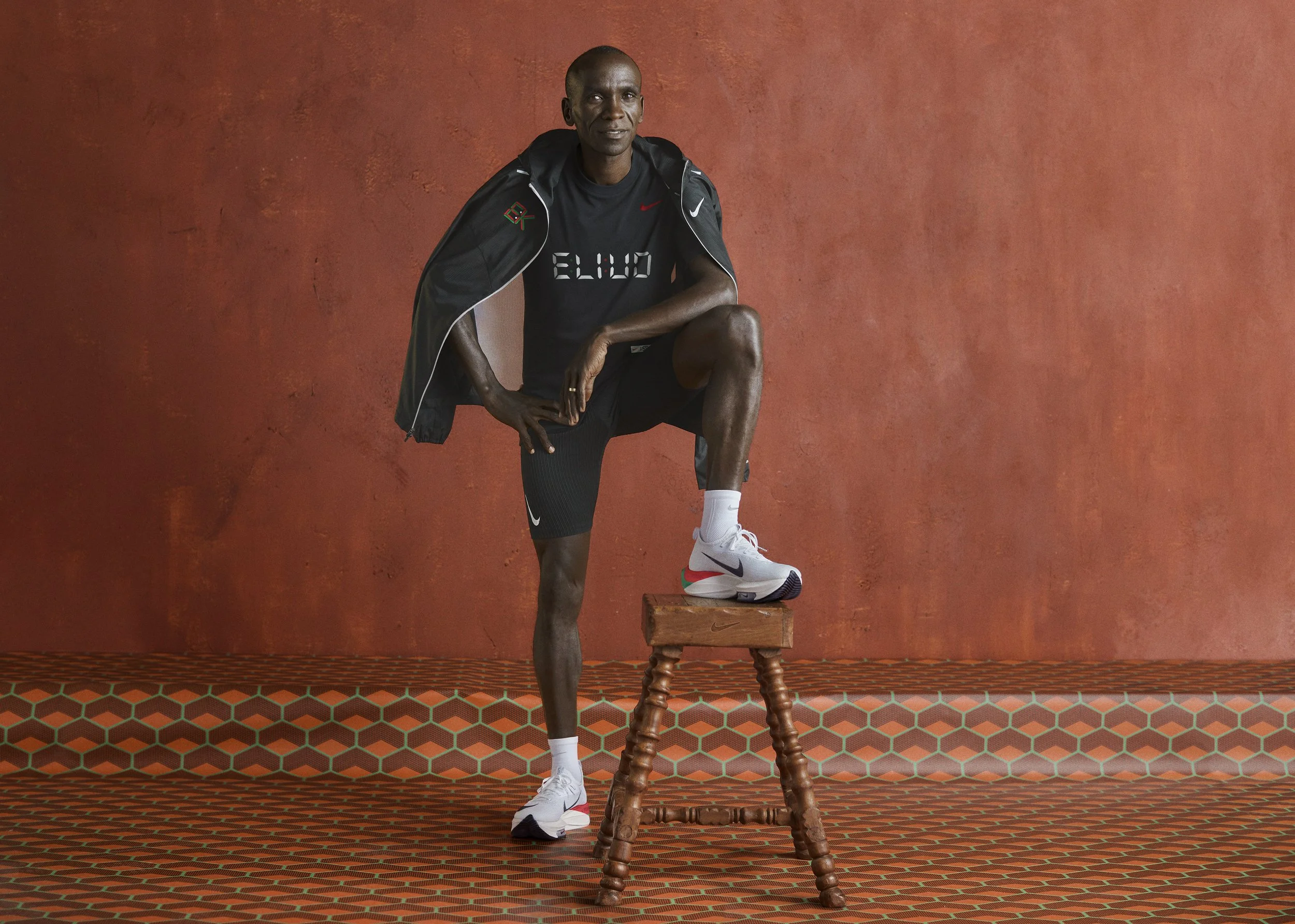 Creative: We looked into the archives of past African photography and found Malik Sadibe, who took mesmerisingly simple photos of his community members during parties, with simple studio set ups, we wanted to emulate this for this shoot and creative direction of Eliud. We mirrored the red tones from the tracks Eliud runs on, and brought in Kenyan prints that are seen within his training camp in Eldoret which we worked with Eliud to get. The result was a beautifully simple yet iconic set of images, and set the precedent for Eliuds creative vision going forwards.